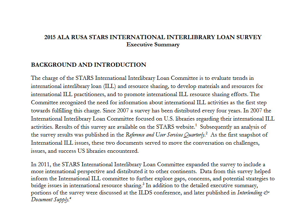towards fulfilling this charge. Since 2007 a survey has been distributed every four years. In 2007 the International Interlibrary Loan Committee focused on U.S. libraries regarding their international ILL activities. Results of this survey are available on the STARS website. Subsequently an analysis of the survey results was published in the Reference and User Services Quarterly. As the first snapshot of