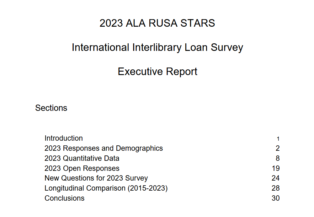 “The quadrennial international interlibrary loan survey is one of the fundamental, core charges of the American Library Association (ALA) Reference & User Services Association (RUSA) Sharing and Transforming Access to Resources Section (STARS) International ILL Committee. The survey was first undertaken in 2007, with the current (2023) survey being the fifth iteration. The 2023 survey was distributed globally in collaboration with the International Federation of Library Associations and Institutions (IFLA) Document Delivery and Resource Sharing Section (DDRS), and was the first survey to be made available in all seven official IFLA languages (i.e., Arabic, Chinese, English, French, German, Russian, and Spanish). The 2023 survey instrument utilized the Qualtrics platform and was built upon the 2019 and 2015 instruments, with the majority of questions from those prior surveys retained in order to facilitate longitudinal comparison.” – quoted here