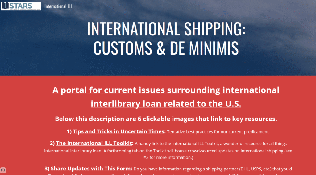 The RUSA STARS International ILL Committee published an International ILL Shipping & Customs webpage hub in response to the chaos caused by the immediate termination of the de minimis exemption in the United States. The hub contains a variety of resources pertaining to international shipping.